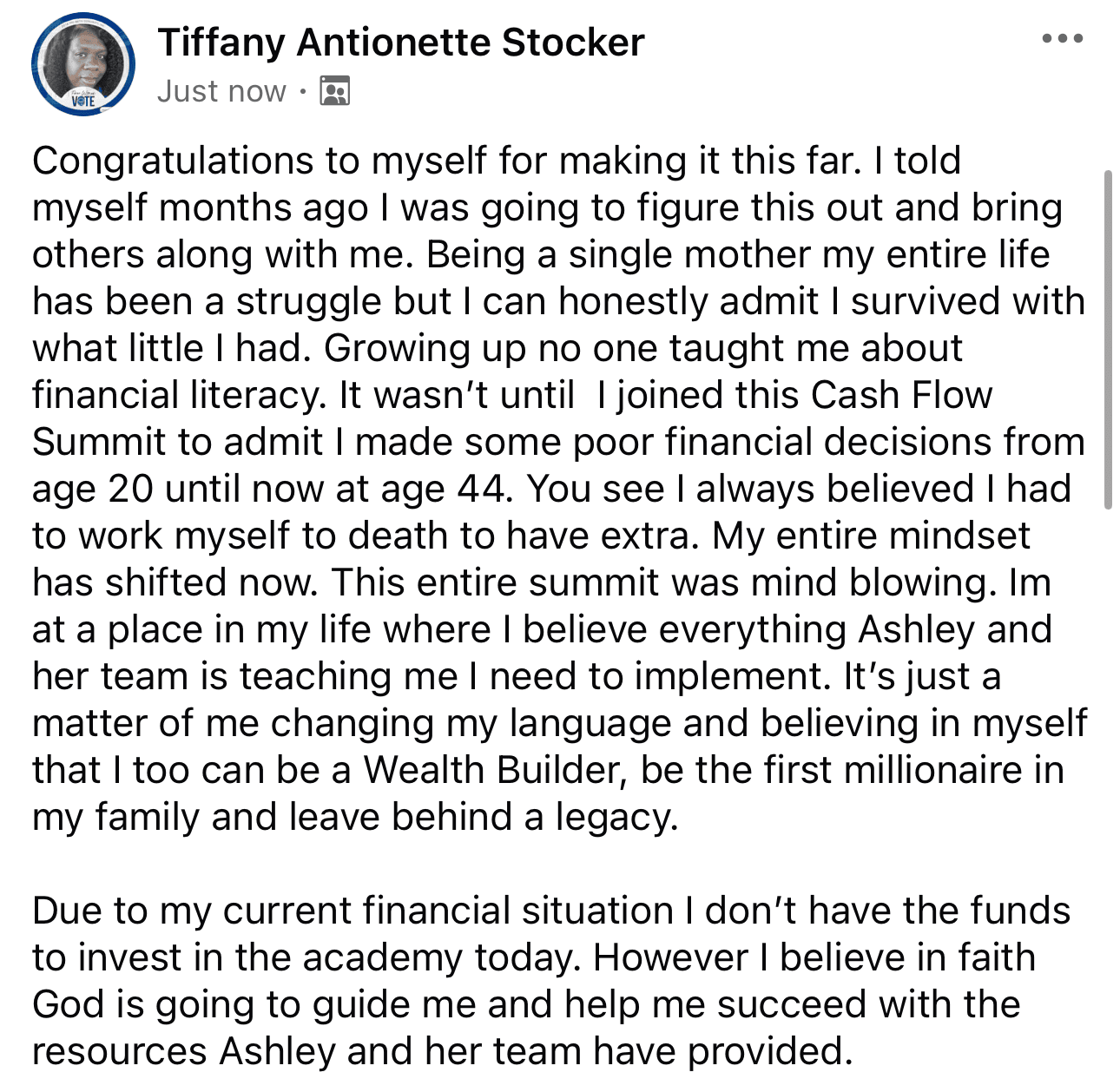 Now, through the Cash Flow Creation Summit Replays, Ashley brings her Wall Street experience, proven investing strategies, and powerful wealth-building frameworks directly to you, so you can learn the exact systems that have already helped thousands of investors create cash flow, build wealth, and secure their financial future.